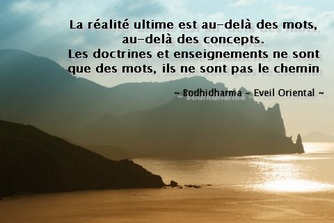 La réalité ultime est au-delà des mots La réalité ultime est au-delà des mots, au-delà des concepts. Les doctrines et enseignements ne sont que des mots, ils ne sont pas le chemin. Partager :PocketTweetPartager sur TumblrPlus Envoyer un lien par e-mail à un ami(ouvre dans une nouvelle fenêtre) E-mail Imprimer(ouvre dans une nouvelle fenêtre) Imprimer Partager sur Reddit(ouvre dans une nouvelle fenêtre) Reddit J’aime chargement…