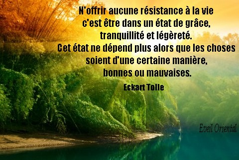 N’offrir aucune résistance à la vie N’offrir aucune résistance à la vie c’est être dans un état de grâce, tranquillité et légèreté. Cet état ne dépend plus alors que les choses soient d’une certaine manière, bonnes ou mauvaises. – Eckart Tolle – Partager :PocketTweetPartager sur TumblrPlus Cliquer pour envoyer un lien par e-mail à un ami(ouvre dans une nouvelle fenêtre) E-mail Cliquer pour imprimer(ouvre dans une nouvelle fenêtre) Imprimer Cliquez pour partager sur Reddit(ouvre dans une nouvelle fenêtre) Reddit J’aime chargement…